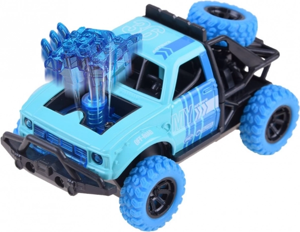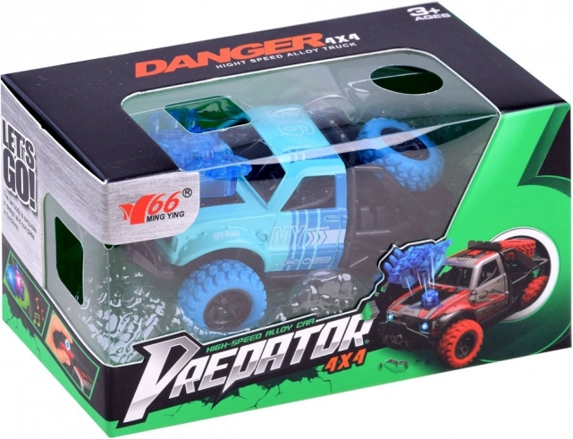 Zabawkowy metalowy samochodzik 4x4 Predator zapewnia pełną akcji jazdę z sprężynowym napędem typu pull-back, efektami świetlnymi oraz realistycznymi dźwiękami silnika, zderzenia i alarmu. Dzięki wytrzymałej konstrukcji z metalową karoserią, gumowymi oponami i solidnym podwoziem poradzi sobie nawet z dzikimi akrobacjami.