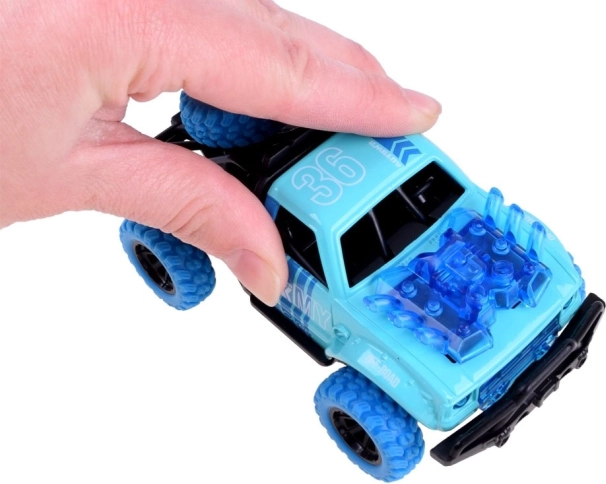 Dzięki metalowej karoserii, gumowym oponom i solidnemu plastikowemu podwoziu zabawka wytrzyma długie godziny zabawy w domu i na zewnątrz. Świetny pomysł na prezent dla małych fanów aut i off‑roadowych przygód.