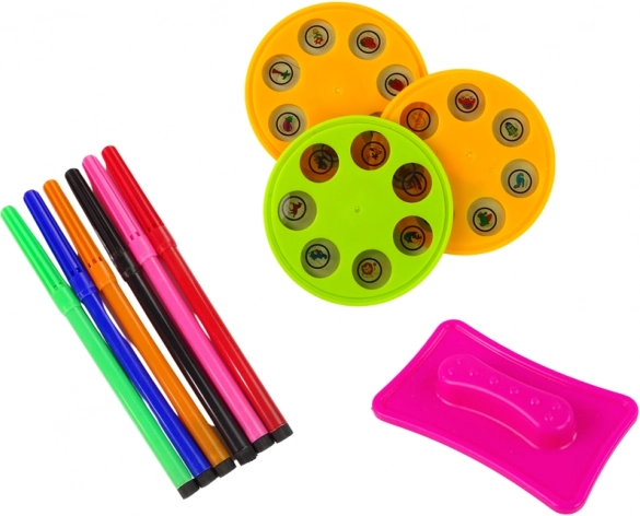 Trzy wymienne dyski z łącznie 21 obrazkami ułatwią dzieciom pierwsze kroki w rysowaniu i pobudzą ich wyobraźnię.