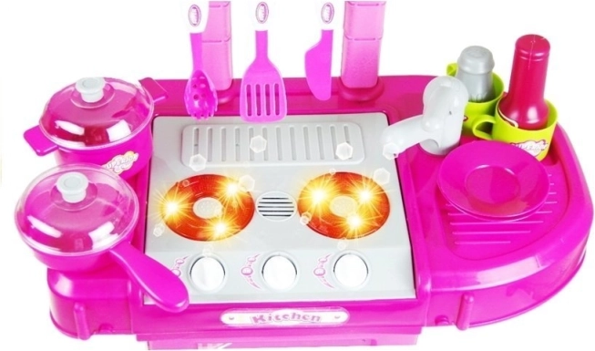 Dwa podświetlane palniki z niezależnymi włącznikami oraz dźwięki gotowania zapewniają dzieciom autentyczne wrażenia kulinarne.