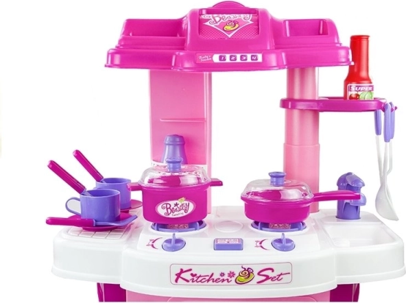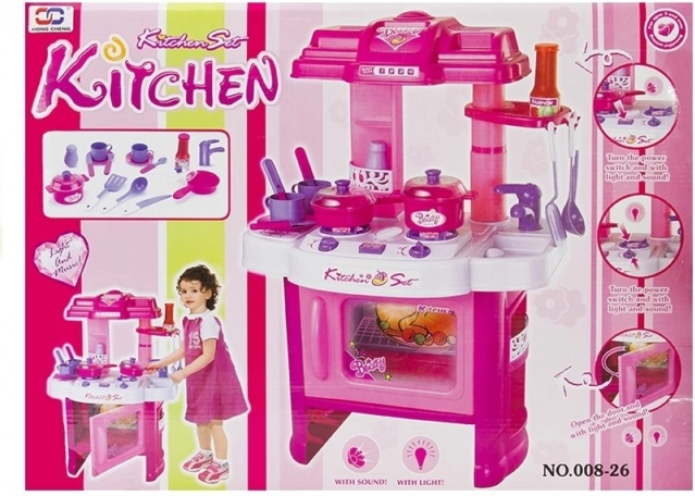 W zestawie znajdują się zlew z kranem, okap, praktyczne półki i haczyki na akcesoria. Zestaw obejmuje garnek, patelnię, przybory, filiżanki ze spodeczkami oraz przyprawniki – wszystko z wysokiej jakości, certyfikowanego plastiku z oznaczeniem CE. Zasilanie zapewniają 3× AA 1,5 V (brak w zestawie).