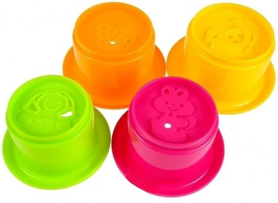 Zestaw zawiera kolorowe kubeczki do układania z motywami ptaszka, dżdżownicy i króliczka dla jeszcze większej frajdy.