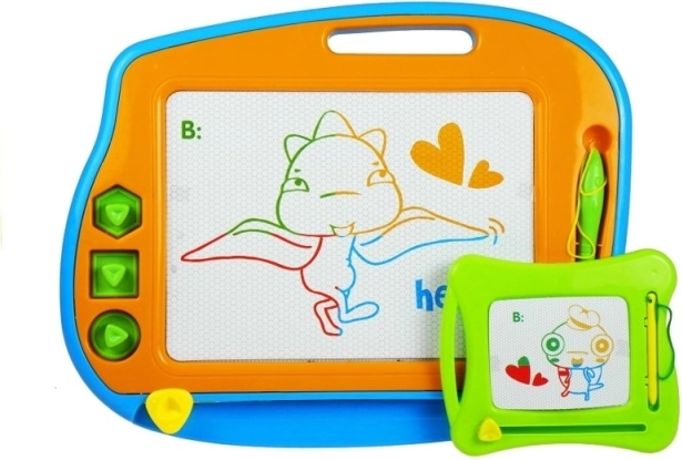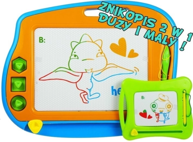 Magnetyczna tablica Znikopis 2w1 to idealna zabawka dla dzieci od trzeciego roku życia, oferująca nieskończoną zabawę i rozwijająca wyobraźnię. Zestaw zawiera dużą i małą tablicę, które są lekkie i łatwe do przenoszenia dzięki praktycznemu uchwytowi. Rysowanie na tablicy jest proste dzięki żelaznym opiłkom pod powierzchnią ekranu, które tworzą piękne, kolorowe rysunki przy użyciu specjalnego długopisu przymocowanego na sznureczku.