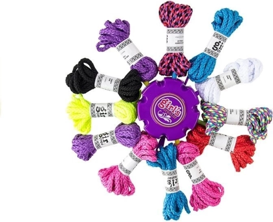 Zestaw zawiera 12 kolorowych sznurków, średnica sznurka to około 0,5 cm. Każdy z nich możesz wykorzystać do stworzenia bransoletki lub warkoczyka. Dodatkowo w opakowaniu znajduje się urządzenie, które ułatwia plecenie i tworzenie bransoletek.
