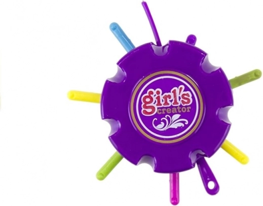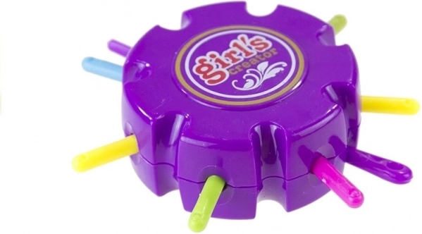 W skład zestawu wchodzi okrągłe urządzenie, które ułatwia plecenie bransoletek i pomaga tworzyć skomplikowane wzory.