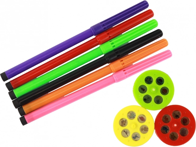 Zestaw zawiera wszystko, czego potrzeba do zabawy: 6 kolorowych pisaków i 2 zestawy wzorów, które można projektować na ścianę lub papier. Łącznie 12 obrazków do stworzenia.