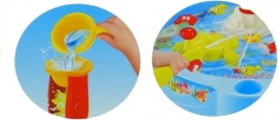 Płynąca woda wprawia w ruch żółty młynek i tworzy mały wodospad. Dzieci poznają zależność przyczyna–skutek i ćwiczą motorykę małą podczas nalewania wody.