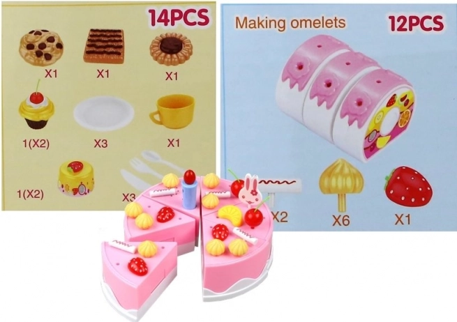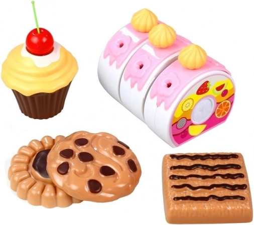 Babeczka, ciasteczka i kawałek rolady urozmaicą każde dziecięce przyjęcie. Elementy są kolorowe i zachęcają do fantazyjnej zabawy w cukiernię.