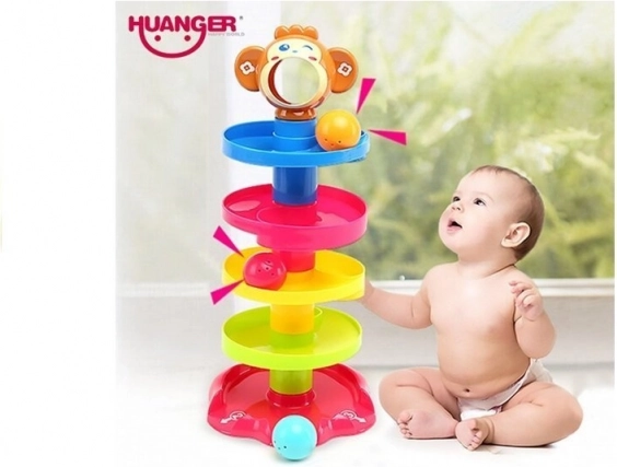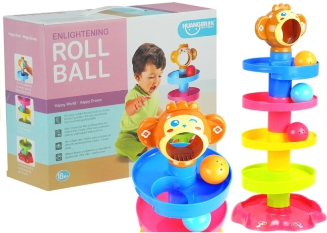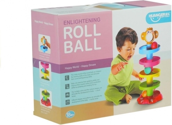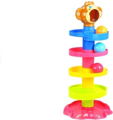 Ta kolorowa wieża kulkowa składa się ze stabilnej podstawy, kilku spiralnych poziomów oraz uroczej główki małpki. Wystarczy włożyć kulkę do otworu na górze i obserwować, jak toczy się po spiralach aż do zjazdu oznaczonego numerami 1, 2 i 3. Wewnątrz kulek znajdują się elementy grzechoczące, które stymulują słuch i pomagają dzieciom rozróżniać dźwięki.