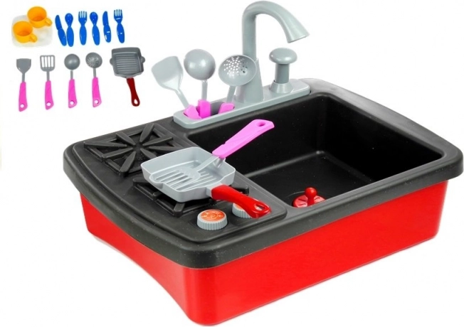 Ten zestaw łączy zlew i kuchenkę, dzięki czemu dzieci mogą naśladować zmywanie naczyń oraz gotowanie.