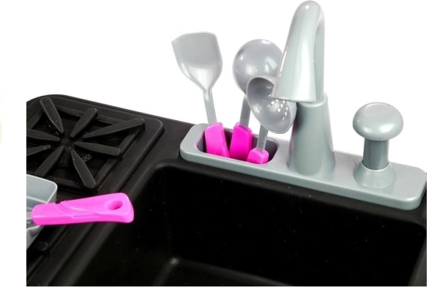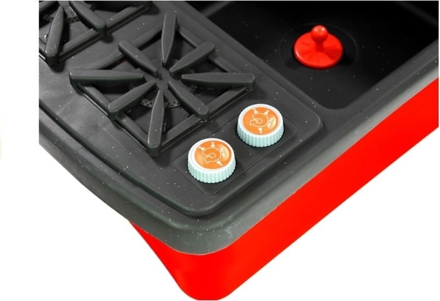 Główną zaletą tej kuchni jest funkcjonalny zlew, który pozwala na odtwarzanie zmywania naczyń. W komplecie znajduje się także kuchenka z dwoma palnikami, pod którymi umieszczono pokrętła wydające dźwięki podczas obracania, co zwiększa realizm zabawy.
