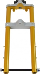 Ten przedni widelec z osią jest przeznaczony do dziecięcego modelu motocykla APRILIA A007. Oferuje solidne mocowanie przedniego koła i niezawodne tłumienie wstrząsów, co zwiększa komfort i stabilność podczas jazdy. Dzięki dokładnie określonym wymiarom wymiana jest szybka i bez komplikacji.