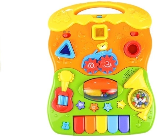 Gwiazdki z dźwiękami instrumentów, mała klawiatura, gitarka ze światłami oraz kształty na sznureczkach rozwijają zmysły, logikę i małą motorykę.