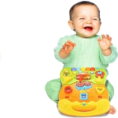 - Efekty świetlne, efekty muzyczne i dźwiękowe, małe pianinko, przyciski, obrotowe grzechotki, przesuwane elementy