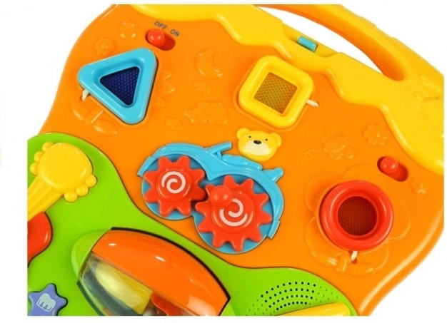 Na panelu dziecko odkryje świecące gwiazdki z dźwiękami (skrzypce, trąbka, bębenek), małą klawiaturę do pierwszych melodii, obrotowe kółeczka, przesuwane elementy i przyciski. Naciśnięcie kilku elementów naraz uruchamia wspólną melodię, gitarka zapala kolorowe światła, a prawidłowo dopasowane kształty na sznureczkach nagradzają dziecko efektami – wszystko to wspiera rozwój małej motoryki, słuchu i koordynacji wzrokowej.
