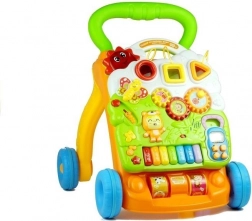 Interaktywny chodzik 2w1 pomaga dzieciom pewnie stawiać pierwsze kroki, a jednocześnie zapewnia mnóstwo zabawy dzięki odłączanemu panelowi. Zawiera pianinko z 7 kolorowymi klawiszami, świecące figury geometryczne, tryby zębate oraz inne przyciski z melodiami i dźwiękami. Panel można łatwo odłączyć i używać samodzielnie podczas zabawy w domu, w łóżeczku lub w podróży. Fraza powitalna jest w języku angielskim.