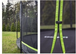 Wytrzymała siatka obwodowa o wysokości ok. 180 cm oraz wyściełane słupki utrzymują skaczących wewnątrz powierzchni do skakania i minimalizują ryzyko urazu przy upadku.