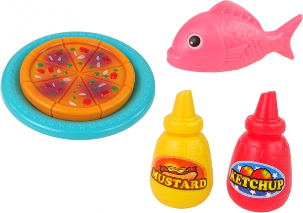 W zestawie znajdują się plastikowe zabawki, takie jak ryba, kurczak i pizza, które zwiększają możliwości zabawy.