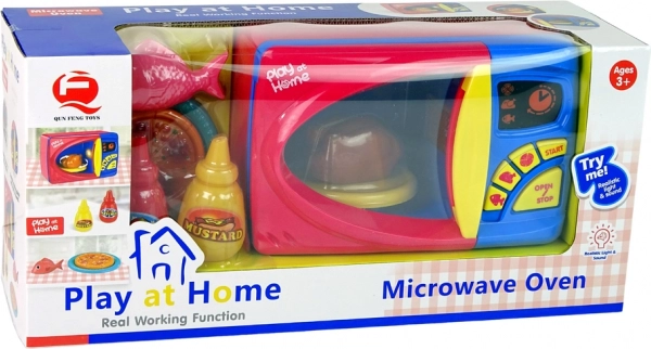 W zestawie znajdują się plastikowe zabawki: ryba, pieczony kurczak, pizza oraz buteleczki ketchupu i musztardy. Po wyjęciu blokady z tylnej części zabawki i wybraniu programu zapala się wewnętrzne światło, a talerz z jedzeniem zaczyna się obracać, co przypomina prawdziwe korzystanie z kuchenki mikrofalowej.
