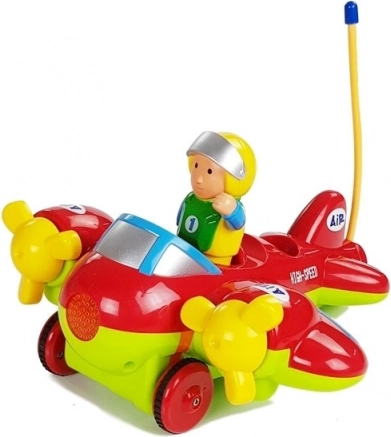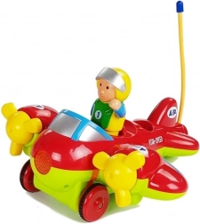 Pilot działa na częstotliwości 27 MHz, co minimalizuje zakłócenia i zapewnia płynną pracę. Sterownik ma kształt kierownicy, idealnie pasuje do małych rączek i posiada dwa przyciski do łatwego sterowania ruchem samolotu.