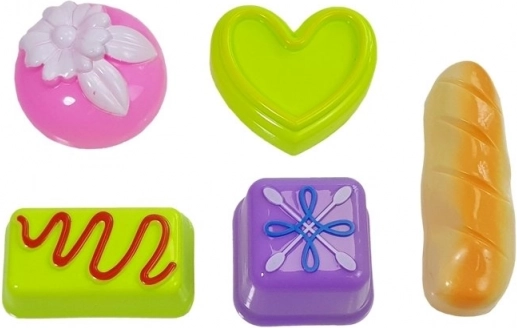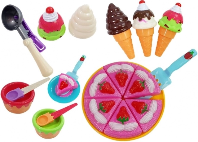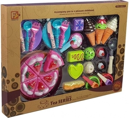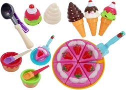Rozbudowany zestaw do zabawy w cukiernię i dom zachwyci każdego małego smakosza. Zawiera tort z 6 kawałków, rożki do lodów, miseczki, talerze, sztućce i foremki. Dzięki żywym kolorom i bogatemu wyposażeniu rozwija wyobraźnię, małą motorykę i umiejętności społeczne. Wykonany z bezpiecznego plastiku, z certyfikatem CE, odpowiedni od 3 lat.