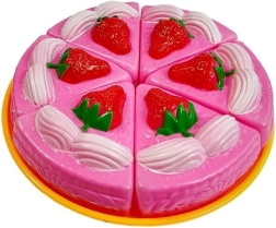 Obejmuje realistycznie wyglądający różowy tort z truskawkami i kremem, który dzieci mogą kroić i serwować.