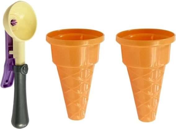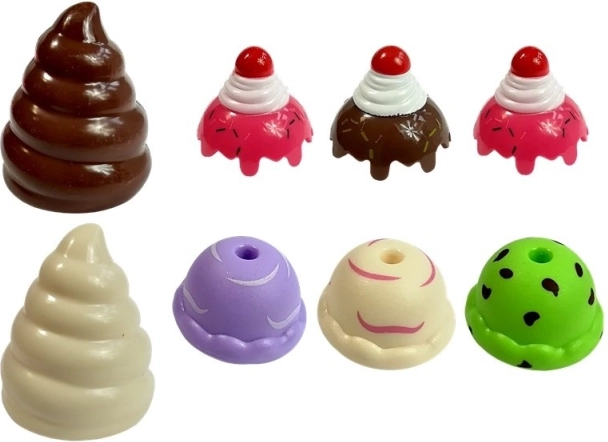 Zestaw zawiera różne rodzaje plastikowych lodów i słodkości, które dodają zabawie jeszcze więcej frajdy.