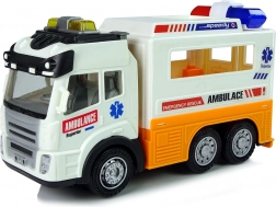 Karetka na baterie z efektami światła i dźwięku spodoba się wszystkim chłopcom, którzy kochają pojazdy. Z tyłu można otworzyć drzwi, kryjące szczegółowo wykonane wnętrze z łóżkiem i miejscem na sprzęt medyczny. Zabawka jest utrzymana w pięknym białym kolorze z pomarańczowymi elementami i typowymi napisami dla ambulansu.