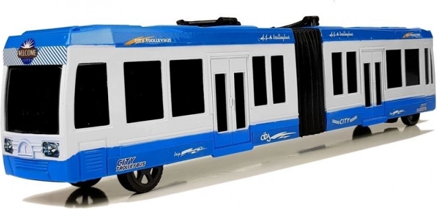 Ten szczegółowo wykonany niebieski przegubowy autobus wygląda jak prawdziwy pojazd miejski. Wystarczy go pociągnąć do tyłu i puścić – dzięki napędowi bezwładnościowemu sam ruszy do przodu. Solidne wykonanie, gumowe opony oraz przegub pośrodku zapewniają płynne skręcanie oraz bezpieczną i przyjemną jazdę po podłodze.