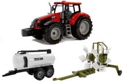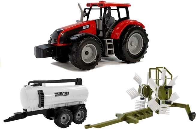 Zestaw traktor + zgrabiarka + cysterna jest idealny dla dzieci, które kochają maszyny rolnicze. Czerwony traktor z realistyczną kabiną holuje albo zieloną obrotową zgrabiarkę, albo białą cysternę na wodę z dużymi kołami dla łatwego poruszania. Dzieci mogą stworzyć własne gospodarstwo i zrozumieć, jak działają maszyny rolnicze.