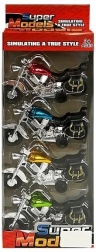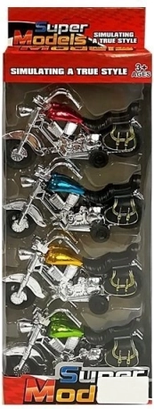 Ten zestaw zawiera cztery kolorowe modele motocykli w barwach: różowej, niebieskiej, złotej i zielonej. Każdy motocykl wykonany jest z wytrzymałego materiału i wyposażony w funkcjonalny mechanizm nakręcany: wystarczy pociągnąć motocykl do tyłu i puścić, aby ruszył do przodu. Dzięki dopracowanemu wzornictwu modele przyciągają uwagę dzieci i zapewniają długotrwałą zabawę.