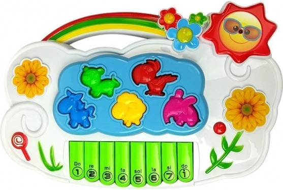 Pianino ma 8 klawiszy oraz pięć zwierzęcych elementów (kot, papuga, koń, owieczka, słoń), które umieszcza się w odpowiednich miejscach – świetna forma zabawy i treningu motoryki małej. Zabawka oferuje wybór 2 języków (angielski, hiszpański) do zabawnej nauki słówek i dźwięków.