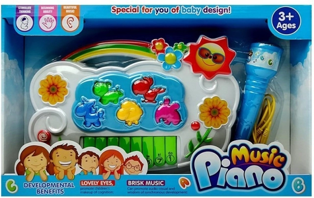 Zabawne interaktywne pianino dla dzieci z mikrofonem i możliwością podłączenia telefonu kablem do odtwarzania muzyki. Oferuje 8 klawiszy, mikrofon karaoke oraz kolorowe wykonanie, które zachęca do zabawy. W zestawie znajdują się także zwierzęce elementy do wkładania w odpowiednie miejsca oraz przełączanie między angielskim i hiszpańskim.
