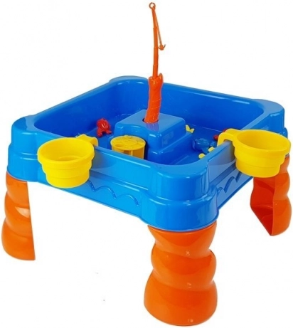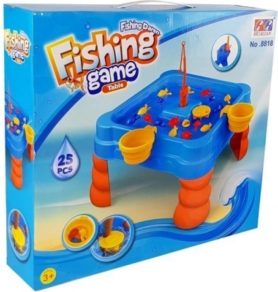 Duża wodna gra wędkarska zamieni każde popołudnie w wesołe łowienie. Napełnij niebiesko–pomarańczowy stolik wodą, wrzuć rybki i za pomocą mechanizmu uruchom prąd, aby wesoło krążyły. Dwóch graczy rywalizuje, kto złowi ich więcej. Gra rozwija małą motorykę, koordynację ręka–oko i koncentrację.