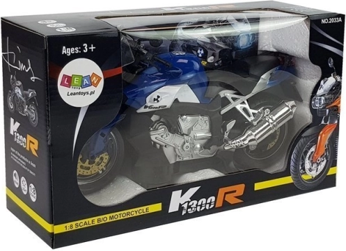 Podczas jazdy motocykl wydaje realistyczne dźwięki szybkiej jazdy, a przednie i tylne światła zapalają się, gdy pojazd rusza. Zabawka jest odpowiednia dla dzieci od 3 lat, spełnia normy CE i EN 71, a zapakowana jest w pudełko prezentowe z przezroczystym okienkiem.