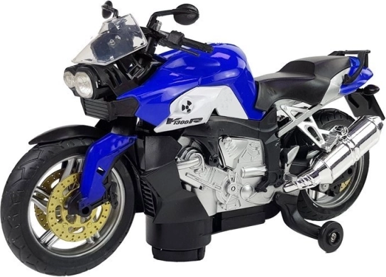 Stylowy dziecięcy motocykl na baterie w niebieskim kolorze ucieszy wszystkich małych fanów szybkich maszyn. Oferuje realistyczne dźwięki, świecące przednie i tylne światła, a dzięki bocznym kółkom stabilną jazdę. Obrotowe dolne kółko zapewnia łatwą manewrowość, idealną do wyścigowych zabaw.