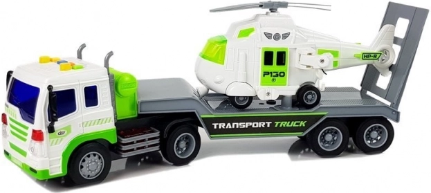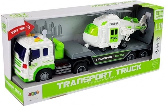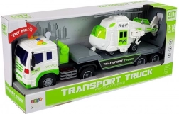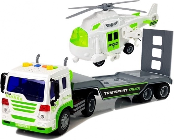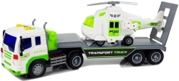Ten szczegółowo wykonany samochód transportowy w biało‑zielonej kolorystyce ma długą platformę do wygodnego załadunku helikoptera lub innych pojazdów. Tylna odchylana rampa ułatwia wjazd i bezpieczne mocowanie ładunku. O frajdę dbają efekty świetlne i dźwiękowe – na dachu kabiny znajdziesz 4 przyciski do rozruchu silnika, klaksonu, dźwięku jazdy i cofania. Dzięki napędowi ciernemu wystarczy naciągnąć auto do tyłu i puścić.
