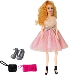 Stylowa lalka modelka z blond włosami w delikatnej, różowej sukience z kokardą ucieszy każdą małą miłośniczkę mody. W zestawie znajdziesz eleganckie szpilki, torebkę oraz aparat fotograficzny dla jeszcze bardziej kreatywnej zabawy. Lalka jest idealna do pokazów mody i scenek, ma delikatny makijaż i stanowi świetny prezent dla dzieci od 3 lat.
