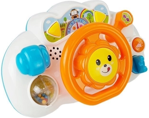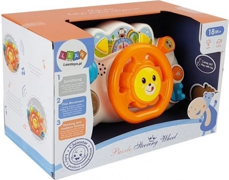 Zabawkowa interaktywna kierownica dla najmłodszych w kolorze pomarańczowym wprowadza świat światełek, dźwięków i muzyki. Dzięki ruchomemu korpusowi, dźwigni zmiany biegów, lusterku i przyciskom z efektami rozwija małą motorykę, percepcję zmysłową oraz koordynację ręka–oko. Idealna w domu i w samochodzie, bezpieczna dla dzieci od 18 miesięcy.