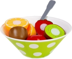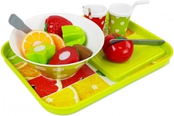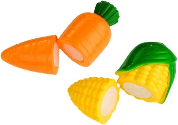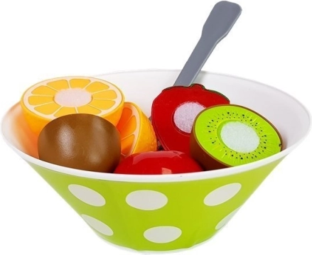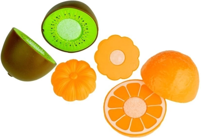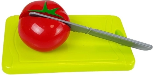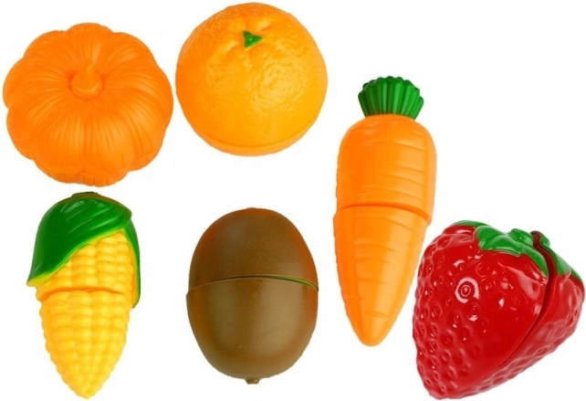 Zestaw zawiera różne rodzaje plastikowych owoców i warzyw, które można łatwo dzielić i łączyć, wspomagając rozwój umiejętności motorycznych.