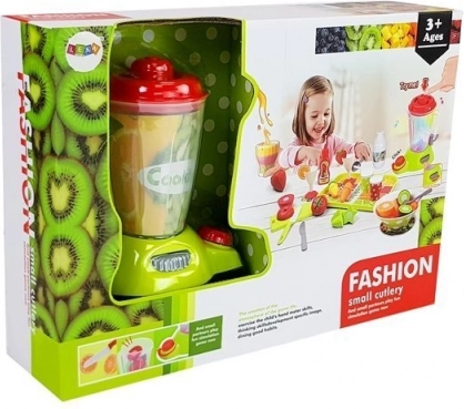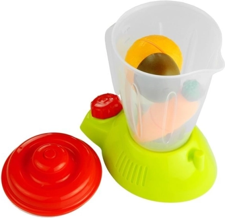 Zestaw zawiera bogatą paletę elementów od miksera z pokrętłem do regulacji prędkości, przez różnorodne plastikowe owoce i warzywa, aż po kubki ze słomką i akcesoria kuchenne. W formie zabawy dzieci poznają takie produkty jak dynia, kukurydza, pomarańcza czy kiwi.
