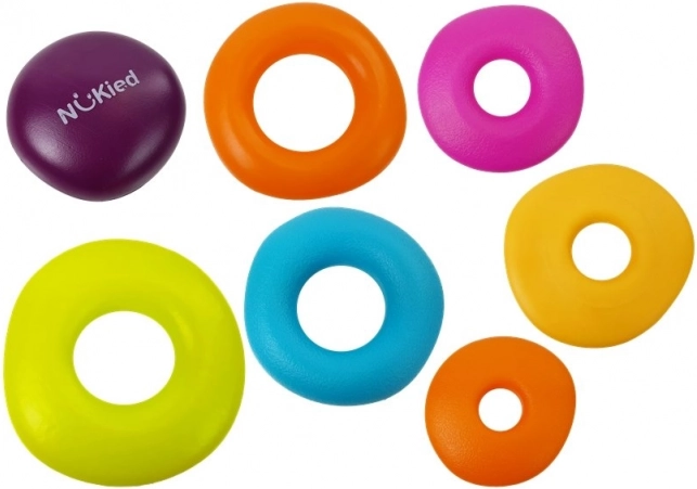 W zestawie znajduje się siedem pierścieni o różnych wielkościach i fakturze, które nie zawsze są regularnym kołem. Dotykając i bawiąc się nimi, dzieci uczą się dostrzegać różnice i ćwiczą swoje umiejętności motoryczne.