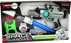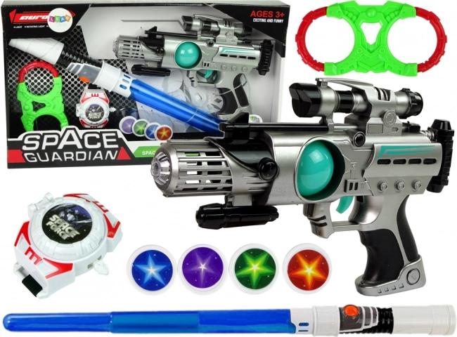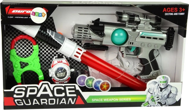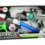 Zestaw kosmicznych broni Space Guardian to pełny pakiet dla wszystkich małych poszukiwaczy przygód. Jest wyposażony nie tylko w laserowy pistolet, ale także świetlny miecz, kajdanki i wyrzutnik dysków dla kompleksowego doświadczenia w grze. Dzięki efektom świetlnym i dźwiękowym zabawa z tym zestawem jest bardziej angażująca i kreatywna.