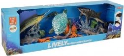 Zestaw składa się z 10 elementów, wśród których znajdują się koralowce, rak, krab, rekin młot, płaszczka, piła, żółw i inne. Trzy większe morskie zwierzęta mają ruchome części (żółw, dwie ryby). Twoje dziecko będzie mogło poruszać ich płetwami, głową i ogonem. W ten sposób rozpocznie swoją przygodę, pływając w głębinach oceanu.