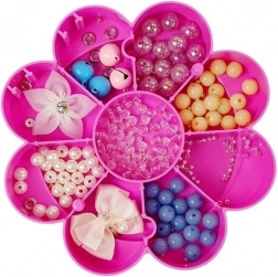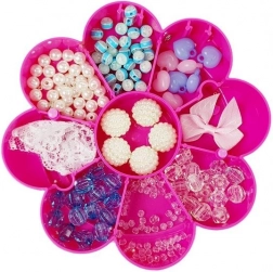 Praktyczny kuferek w różowo-białym kolorze ma kształt kwiatka i kilka przegródek do przejrzystego sortowania koralików i dodatków. Wszystko jest zawsze gotowe do tworzenia.