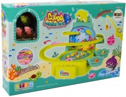 Zestaw zawiera delfiny, kaczuszki i rybki, dwa akwaria, wędki, elementy zjeżdżalni oraz naklejki – wszystko do kreatywnej i długiej zabawy.