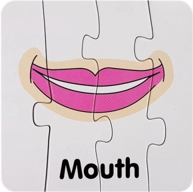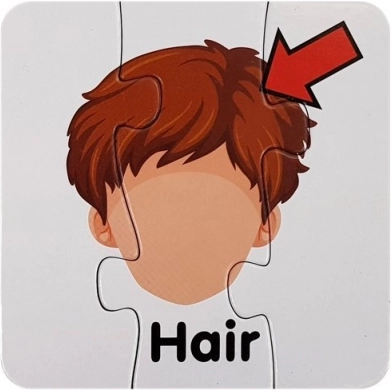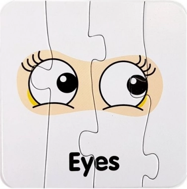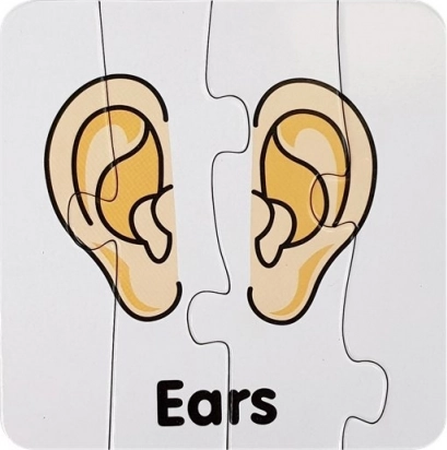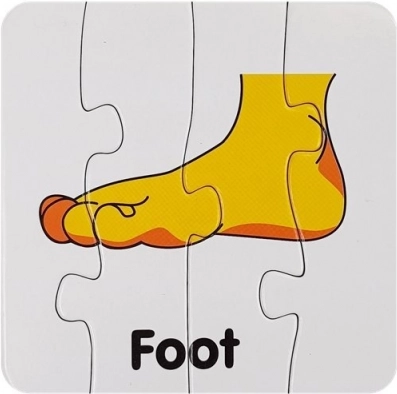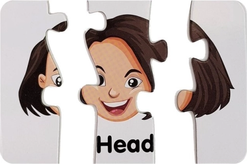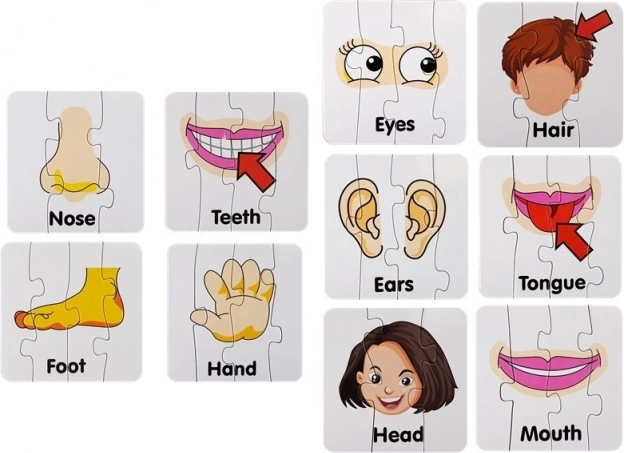 Ten zestaw zawiera kartonowe puzzle z ilustracjami części ciała, każda z wyraźnym angielskim podpisem (np. Eyes, Nose, Mouth, Hand). Dzięki samosprawdzającemu parowaniu dzieci łatwo weryfikują poprawność, co wspiera samodzielność i pewność siebie.