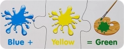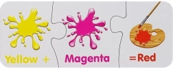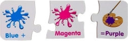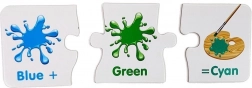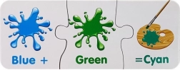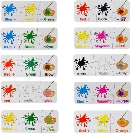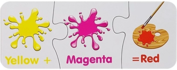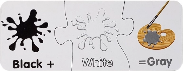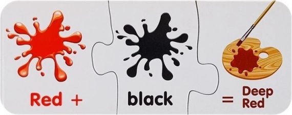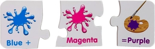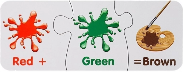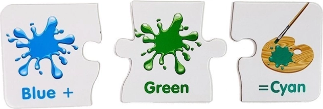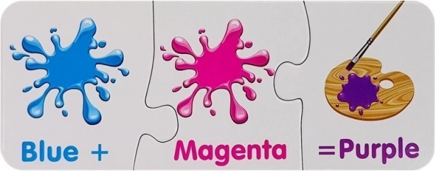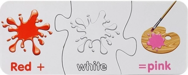 Każde mini‑puzzle pokazuje dwa kolory i powstały odcień. Dzieci szybko zrozumieją zasady mieszania i lepiej zapamiętają kolory.