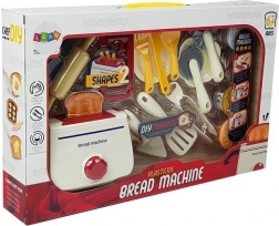Toster, 2 wymienne nasadki (tosty, podłużne „makaroniki”), 4 kubeczki plasteliny, talerzyki, łyżka, widelec, szpatułka/łopatka, nóż, wałeczek, miska