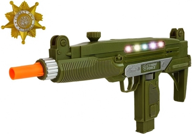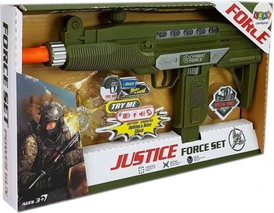 Duży dziecięcy pistolet w ciemnozielonej kolorystyce po naciśnięciu spustu rozświetla się diodami LED, wydaje autentyczne dźwięki strzałów i uruchamia efekt wibracji. W skład zestawu wchodzi także odznaka, dzięki której mały bohater łatwo wcieli się w członka jednostek specjalnych. Zabawka idealnie uzupełni strój na karnawał oraz codzienną przygodową zabawę.